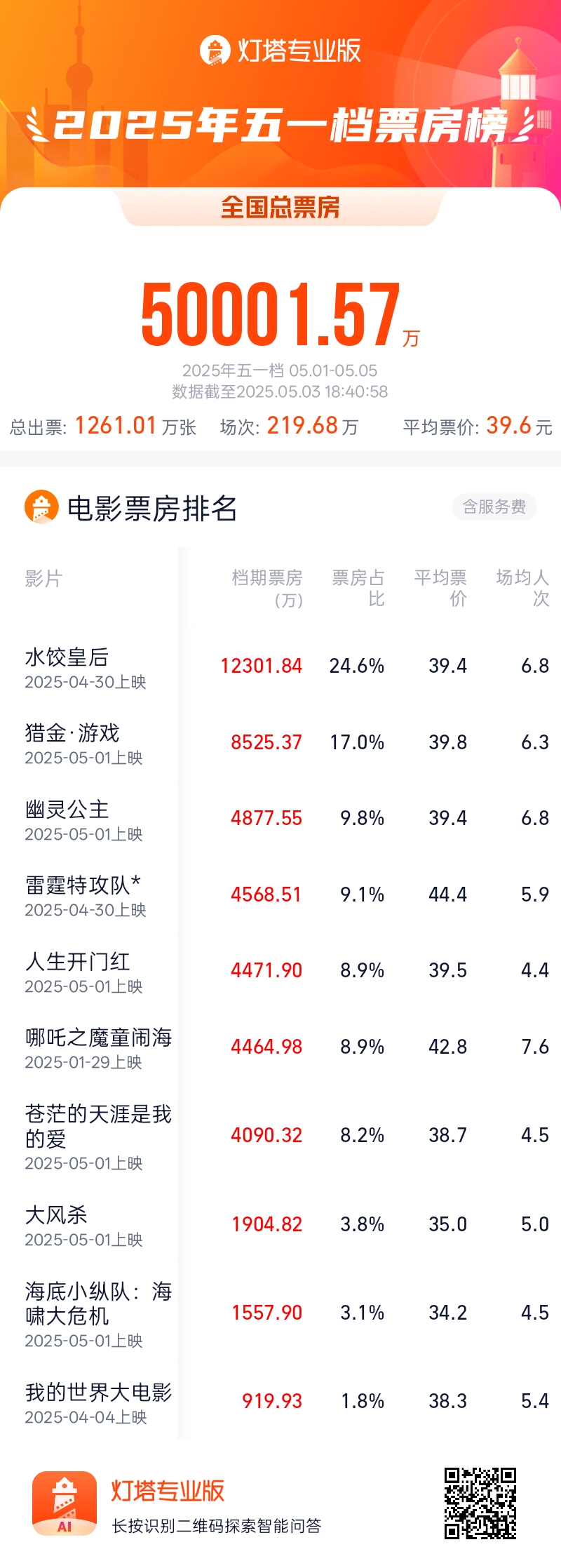 上证报中国证券网讯(记者 杨翔菲) 据灯塔专业版,截至5月3日18时40分,2025年五一档(5月1日-5月5日)档期内总票房(含预售)已突破5亿元,影片《水饺皇后》《猎金·游戏》《幽灵公主》暂列前三名。